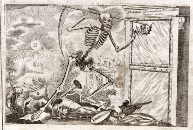 第一个例子是死亡天使,有翅膀的骷髅,手持镰刀,手里还有一个计时杯。在死亡天使的周围,散落着各种权利和财富的象征,包括俗世的和教会的,从王冠、托钵和教皇冠冕,后面还有倒塌的塔楼、大型的宫殿。这给我们的教训是死亡降临到所有的人身上,世俗的权利和财富是转瞬即逝。