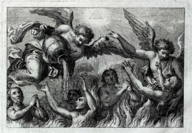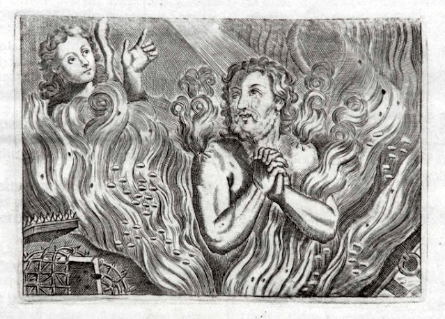第十个例子,我们看到炼灵在炼狱之火中得净化,而一位天使向他们浇灌治愈的恩典之水。