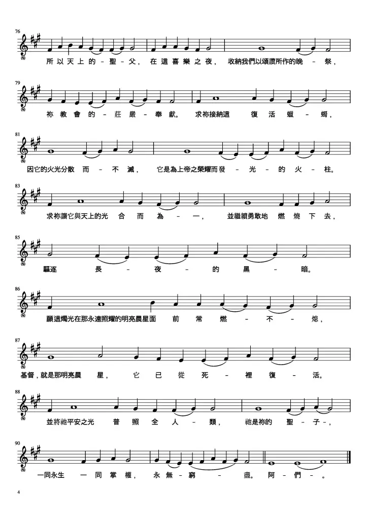 求禰接納這復活蠟燭,因它的火光分散而不滅:它是為上帝之榮耀而發光的火柱。求禰讓它與天上的光合而為一,並繼續勇敢地燃燒下去,驅逐長夜的黑暗!願這燭光在那永遠照耀的明亮晨星面前常燃不熄,基督就是那明亮晨星,祂已從死裡復活,並將祂平安之光普照全人類,祂是禰的聖子,一同永生,一同掌權,永無窮盡。