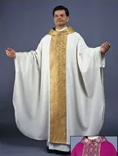 祭披是一种装饰性很强的感恩祭法衣,是一块圆形/椭圆形的织物,上面有一个供佩戴者头部穿的孔,通常装饰华丽。源自古罗马的“Casula”,这是一种外层旅行服装,类似于雨披。这是一件非常正式的礼仪法衣,几乎只在圣体圣事期间穿着,表示庄严。祭披总是作为法衣的最外层穿着,白长袍和圣带在下面。只有神职人员可以穿祭披。祭披与礼仪日历的颜色相匹配。在教会历史上,祭披在 16 世纪的宗教改革运动中被禁止后,在 19 世纪的牛津运动中复兴。