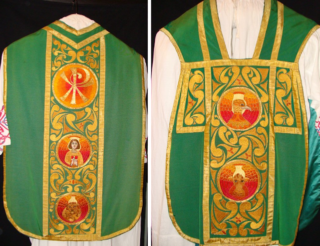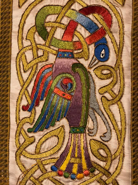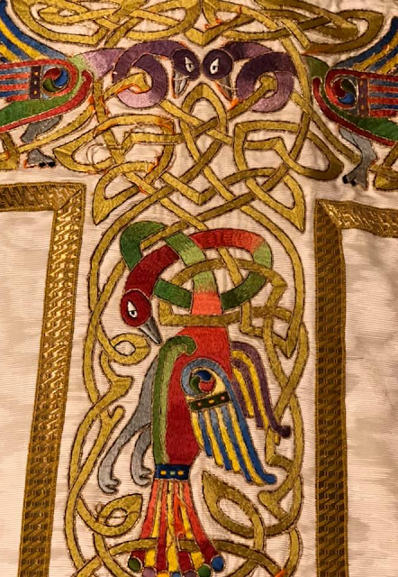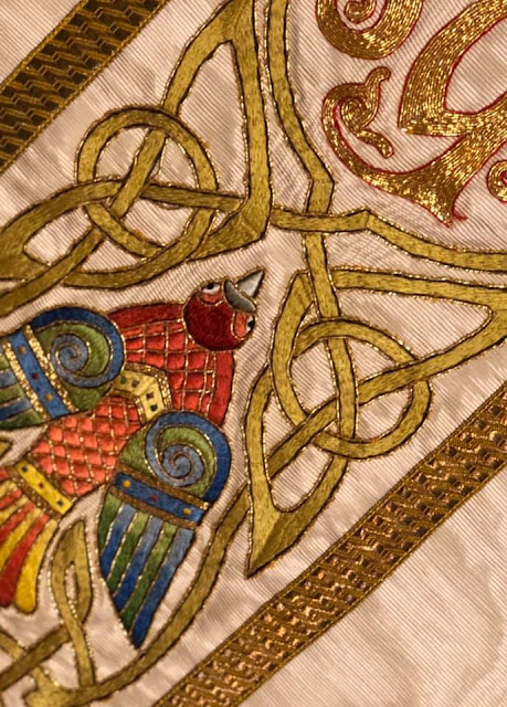 今天是圣帕特里克节(3月17日),这似乎是通过查看此类型的一些示例来探索这一概念的好日子。动物形态传统是将凯尔特编织与交织在一起的动物描绘相结合的传统,这似乎尤其令人感兴趣。这是将这种传统带入祭衣领域的一个例子: