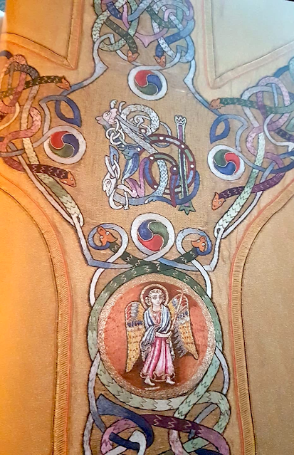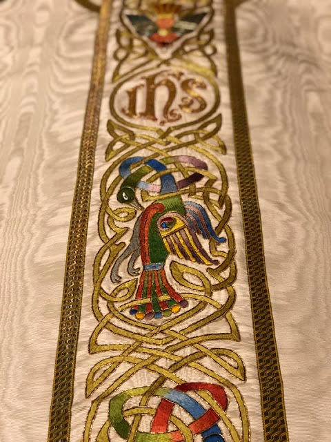 长期以来让我着迷的一个主题是受凯尔特彩饰(博主注:Celtic illumination,指中世纪前中期凯尔特修道院里的神圣艺术与彩绘等)启发的祭衣问题。人们只需想到著名的凯尔斯之书(Book of Kells,再凯尔特修道院里产生的带插图拉丁文福音书)就会想到它在祭衣工作方面可能具有的潜力。然而,无论出于何种原因,此类工作很少见,但它给我的印象是,如果处理得当,它具有不可思议的潜力。