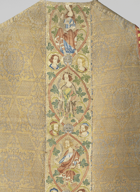 这件圣文森祭披 (San Vicente Chasuble)可追溯至 13 世纪下半叶,具体来说是 1300-1360 年左右。首先引起我注意的是刺绣美丽的色彩,由棕色、黄色、赭石色、蓝色和绿色的微妙色调组成,设置在黄油色的背景上。
