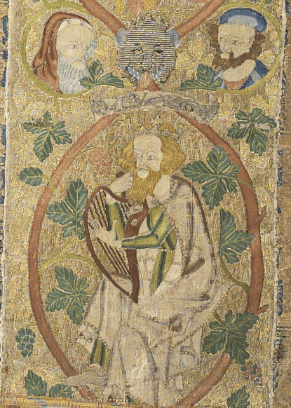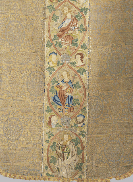 该刺绣实际上是备受追捧的英伦刺绣(Opus Anglicanum)的残余部分,描绘了一个非常流行的中世纪主题:耶西之树。当然,耶西之树是指旧约中弥赛亚的预言,这些预言在基督身上达到了顶峰,显示了基督的家谱和大卫的血统,大卫王位于刺绣的底部,而刺绣的顶部是圣母与圣婴。