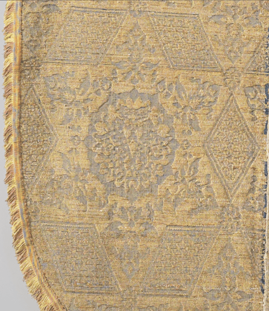 在这个历史时期,使用的许多珍贵的丝绸纺织品都是从东方进口的,这件祭披也不例外,主要纺织品来自蒙古。 人们还会注意到祭披边缘周围的两种颜色的流苏。这种流苏在整个文艺复兴时期很常见,但此后就开始被废除。