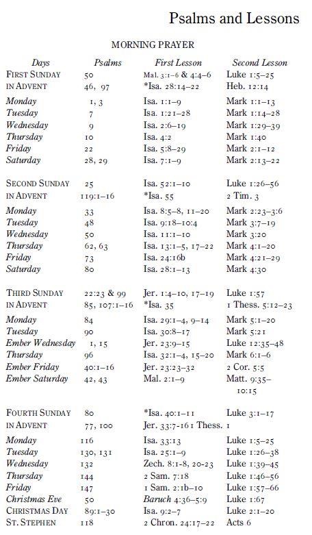 1979年美国《公祷书》的日课读经表,不同于《修订通用经课表》,是每日读经的内容。它是为期两年的阅读周期。基本上是按着顺序通读圣经的经卷,但是它也会遵循教会礼仪年的主题。更多内容可以参考以下链接:Daily Office Lectionary