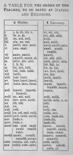 1928年美国《公祷书》延续了原本克兰麦大主教的设计,一个月读完一遍诗篇。按着时间,将150篇诗篇分为60部分,每日早晚祷各诵读1部分,三十天内诵读完诗篇。这很显然是采纳了修道院的早晚课的安排。