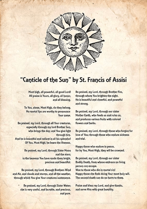 “我们的主上帝与他一切被造者,是应当赞美的,尤其是携赐我们白日与光明的弟兄一太阳。他是公正的,且以绝顶的光明照射,他对我们表现了你 !”
