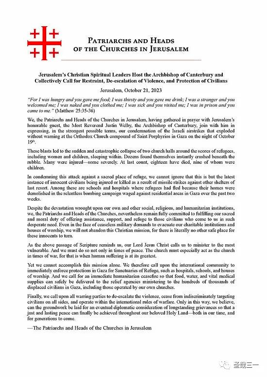 耶路撒冷牧首塞奥菲洛斯及其他巴勒斯坦地区的宗教领袖在上周六发表了另一则声明,呼吁双方保持克制、停止暴力行为,并保护无辜平民。