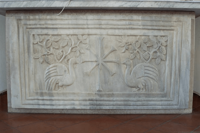 孔雀作为装饰用途的历史可以追溯到基督教之前,可以追溯到希腊罗马世界。到了二世纪末或三世纪初,我们发现它也出现在基督教艺术中,特别是在葬礼壁画中,之后又出现在基督教石棺上。这种特殊联系的原因无疑植根于当时的信念,即孔雀的肉即使死后也不会腐烂——圣奥古斯丁在《上帝之城》中提到了这一点: