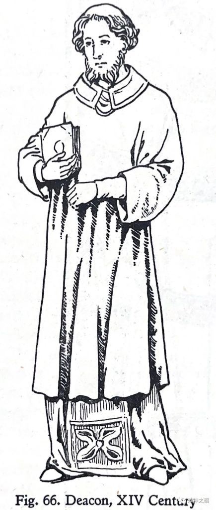 图66中神职人员所穿的白衣比上个世纪提到的三位圣职人员所穿的白衣稍微长一些,并且紧贴地面;袖子在前臂处较宽,唯一的装饰是衣服的前后。这幅插图大约1320年前后。