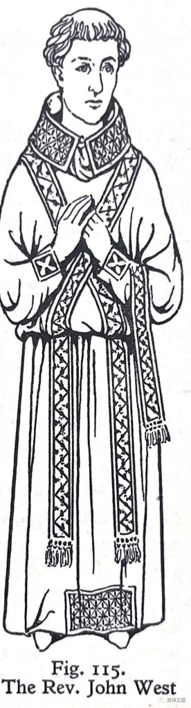 图115是若翰.韦斯特神父(Rev. John West)的纪念铜像的素描像,其年代约为1415年。在这幅画中,我们可以看到束在腰上的长白衣全貌,它被缝制在它上面的装饰刺绣所掩盖。