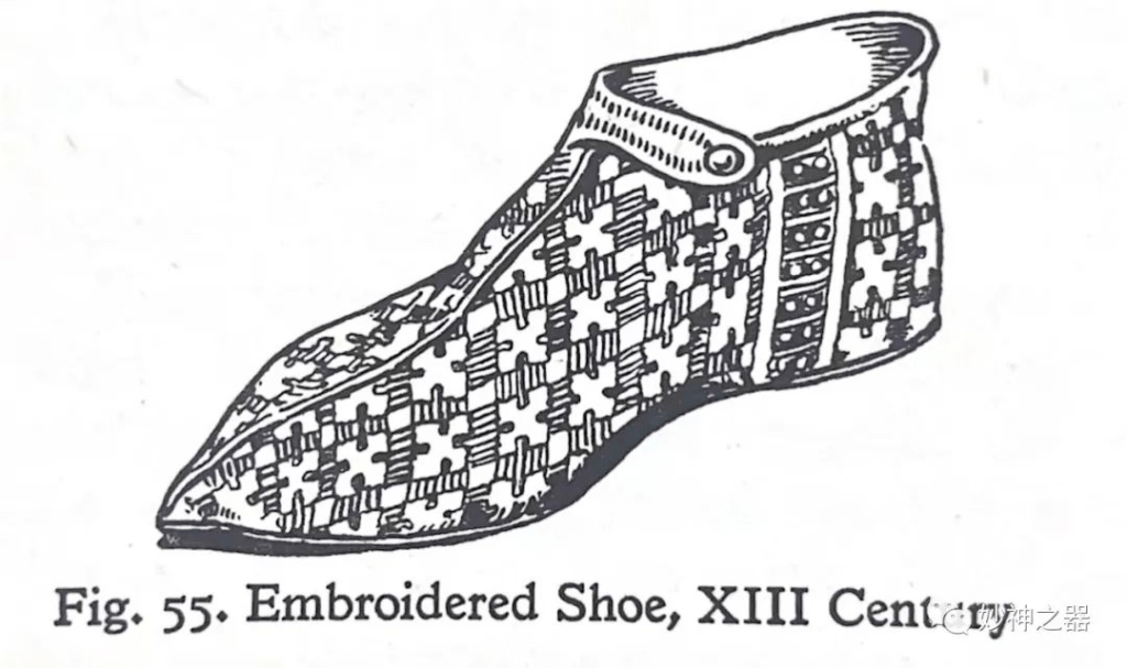 无论是教会的、皇室的,还是世俗富贵人家的,与正式服装穿在一起的鞋子都非常华丽,它由彩色皮革、布料或丝绸制成,并在接缝处用金带装饰。鞋底通常是刺绣的,主要是菱形、正方形和圆形,如图54所示;