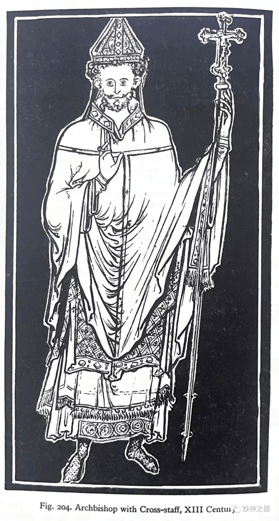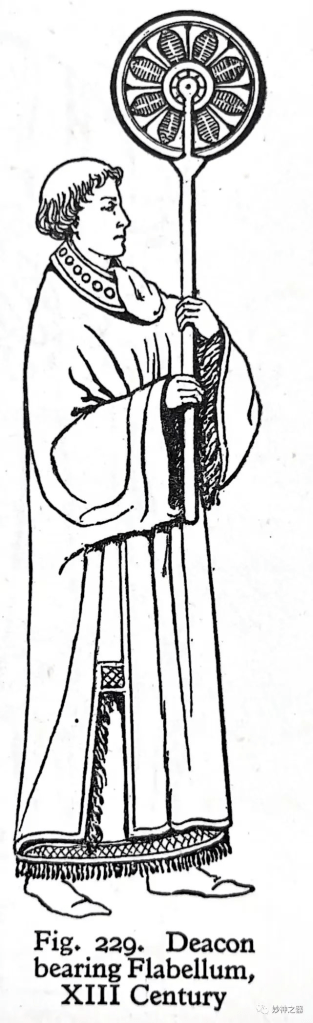 当然,Dalmatica的两侧从大约腰部到下摆都是敞开的。主教的Dalmatica在双缝(译注:此处指执事褂上的两条纵行花纹的部分)和双袖的边缘以及下摆的边缘都有流苏(fringe),显然是从东方教会引进的习惯,见图版四。
