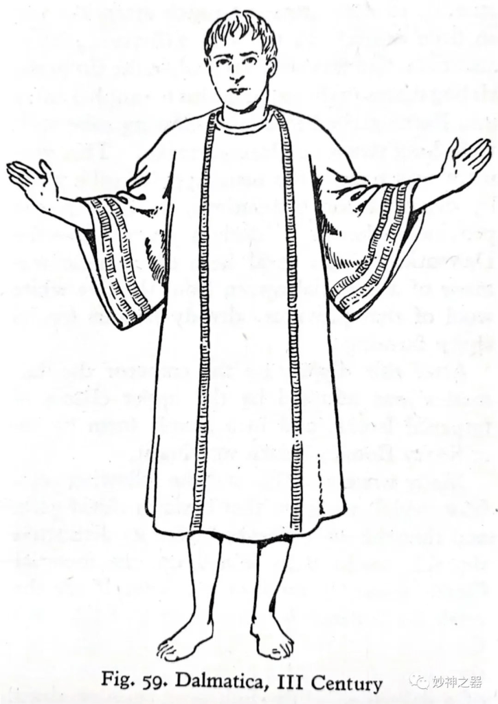 在康茂德皇帝穿着达尔马提卡公开展示之后,这种衣服被罗马帝国的上层阶级所采用,并以一种简单的形式被一般民众所采用。图57显示了一位普通的罗马市民穿着Dalmatica。