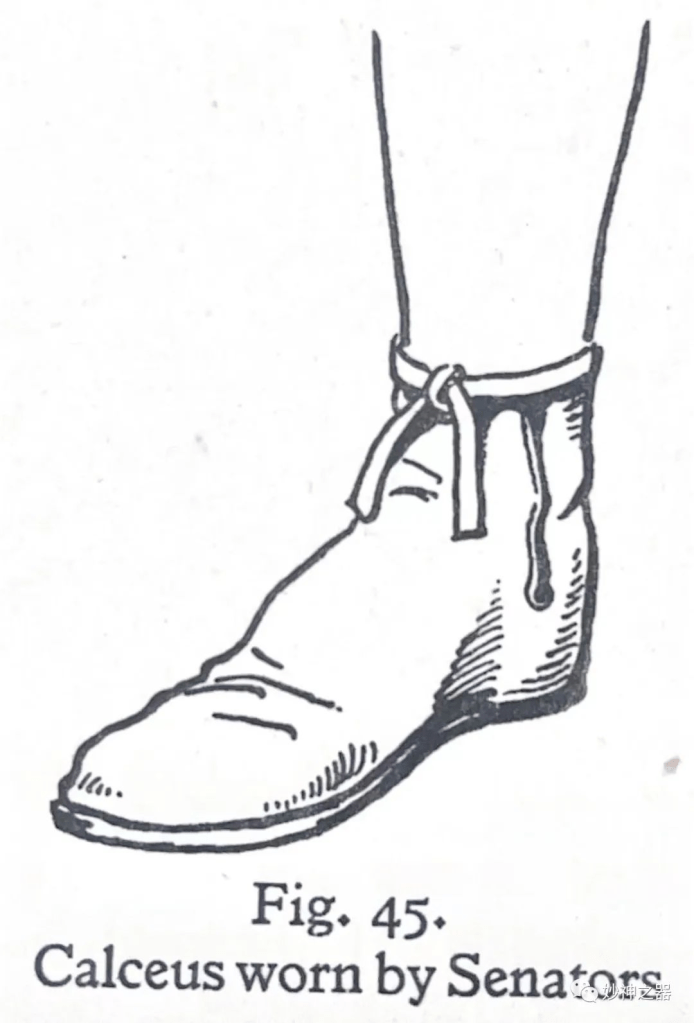 元老所穿的高底礼鞋(calcei senatori)是指普通元老们穿的靴子,它的形状如图45所示,是用红色皮革做的,只有一条绑带系在后面,绑在脚踝上。鞋带有时可能是黑色的。