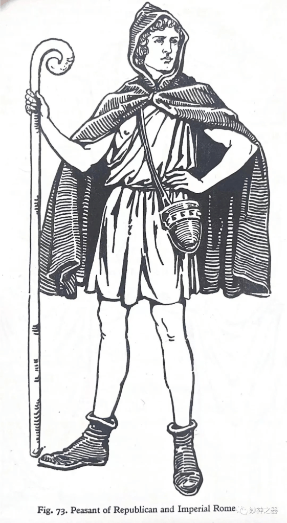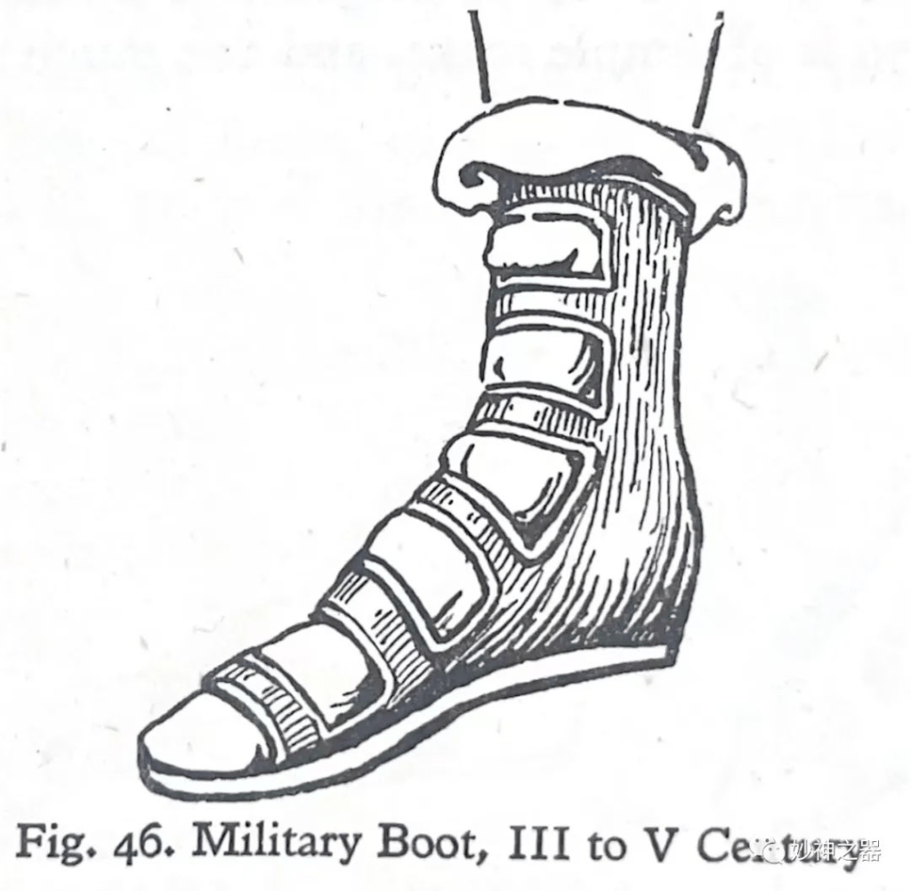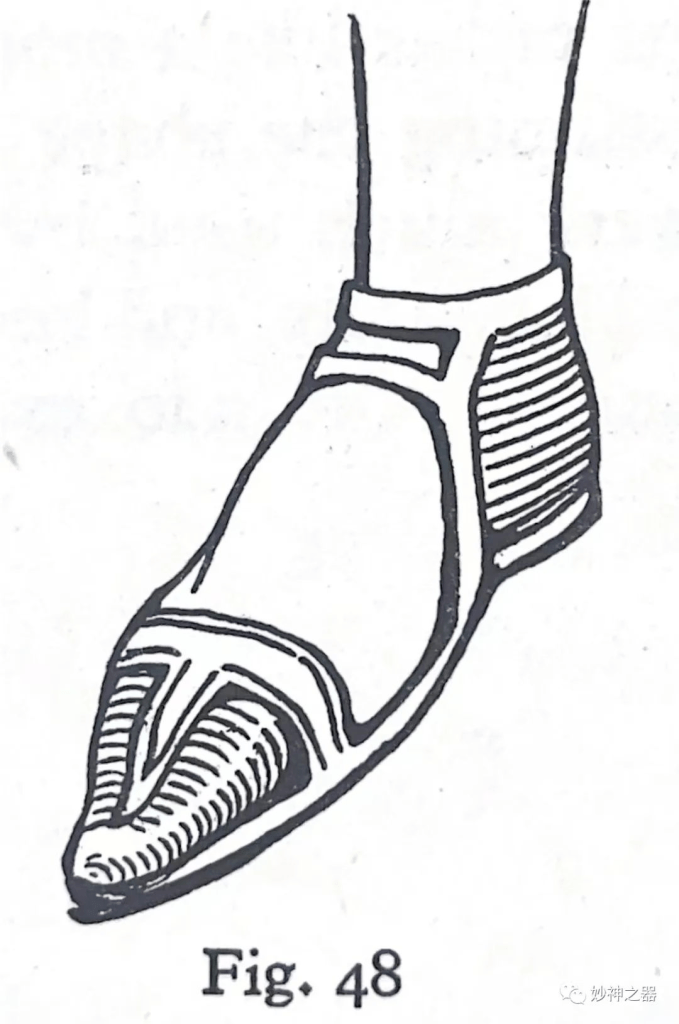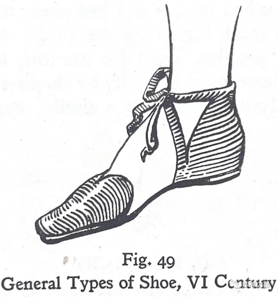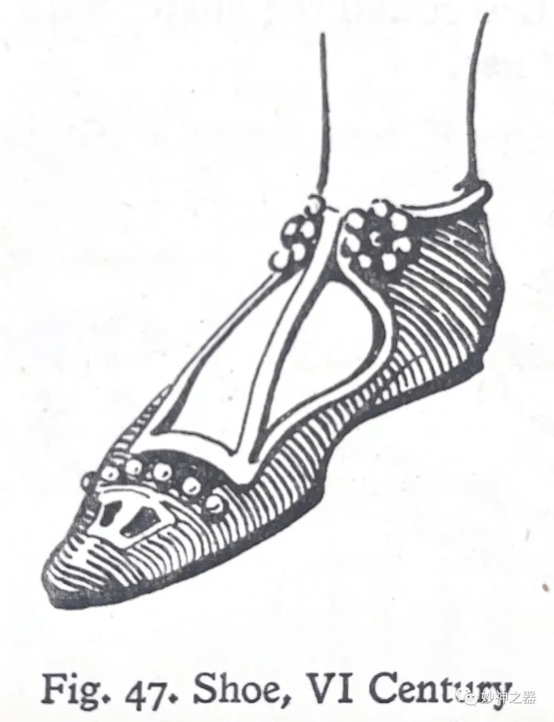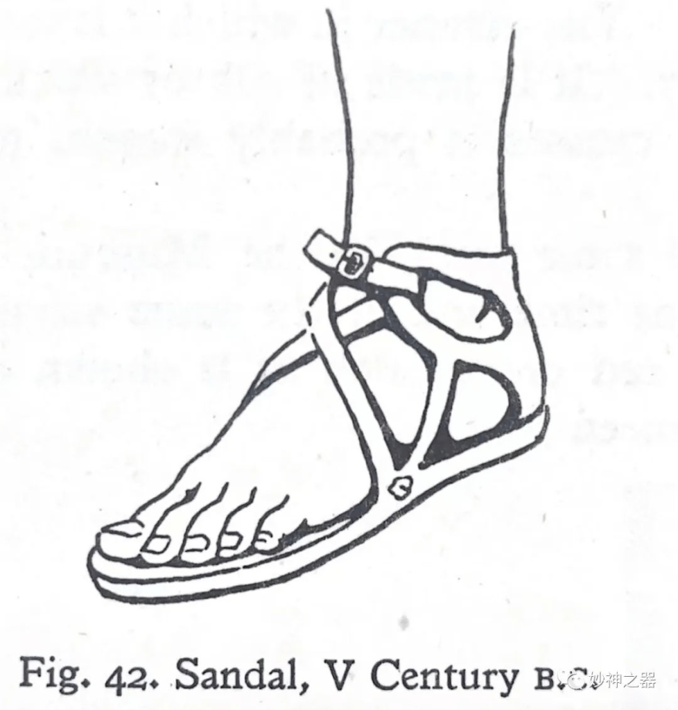 在前教会时代(pre-Christian era),人们普遍使用皮革凉鞋(sandal of leather)。图42显示了这一种形式的鞋子。某些重要人物则穿靴子。