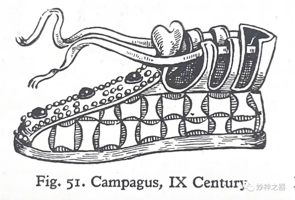 图51中的军靴(campagus)是查理曼大帝(Emperor Charlemagne)时代的鞋子,与他在公元800年加冕时所穿的鞋子相似。它是用猩红色的皮革绣上黄金制作的。在脚背上,金色的带子发展成一个舌头,上面装饰着三颗大的圆形祖母绿和许多珍珠。鞋的后面部分被剪成带状,形成一个半圆形环状结构,用于鞋带穿过这些孔洞系紧鞋子。