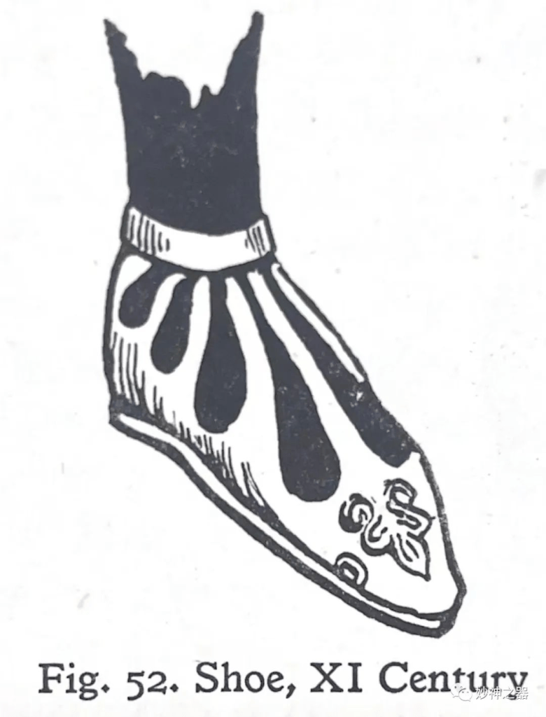 图53,给出了流行鞋履(fashionable shoe)的进一步发展,它被富裕的俗人和圣职人员使用。脚背上的装饰带通常是刺绣的,有时还镶有珠宝。两边斜缝着两条金带,以掩盖接缝。