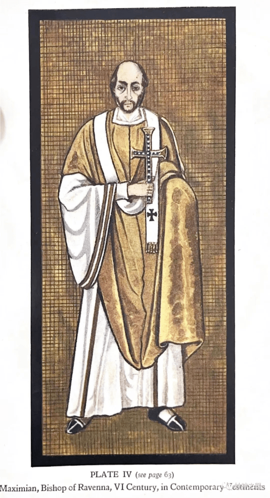 主教的右手拿着由宝石和珍珠镶金而成的十字架,左手却裹着祭披。他的便鞋(sandals)是黑色的,有白色的装饰条纹,有点像图48所示的样子,并穿在白色的袜子外。总体来说,这些祭衣简单而庄重,与人们对一个奢侈时代的高级教长主持重大节日的华丽服装设想截然相反。马克西米安主教于556年左右安息主怀。