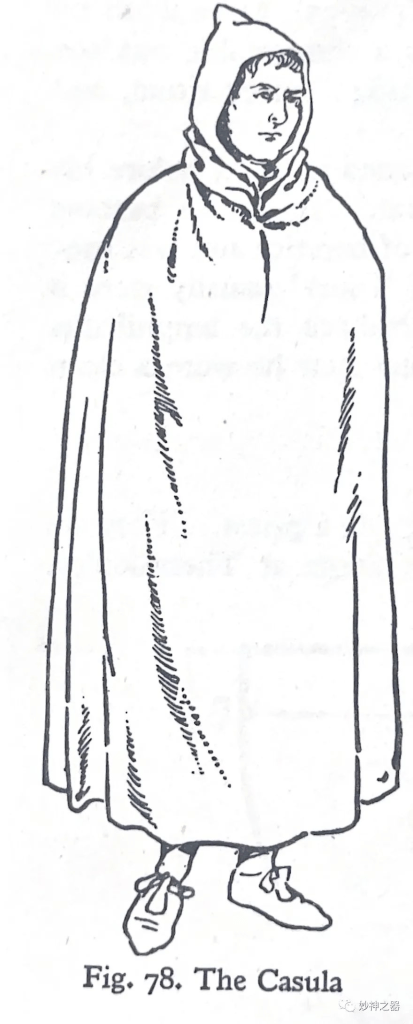 而且户外连帽斗篷“没有袖子”,前面没有开叉或开口,因此颈孔相当大;很明显,从所有的意图和使用目的来看,PAENULA和CASULA都是同一件服饰。