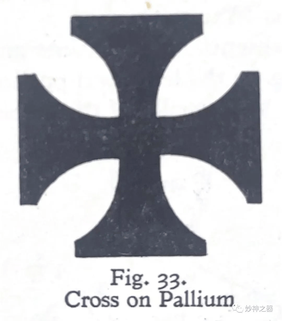 这位希腊教会的主教似乎穿着一件长白衣(Alb),白衣上有深棕色的纵行花纹,只有一边袖子的部分是可见的,外面穿着一件金棕色丝绸的无衬里祭披。祭披颈口呈白色,形状普通,造型如图100。即使在马赛克作品中,祭披前面的接缝也很清楚。在祭披之上是白羊毛披肩(omophorion/Pallium)。前面和后面都绣着一个与图33相同款式的黑色十字架,并镶着金边。