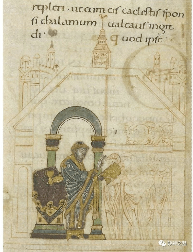 在这期间,礼仪服饰几乎没有变化;因此,这个微型画作无疑是一个可靠的权威,显示了十世纪该圣人所穿着的全部主教服饰。除了脖子和手腕上系着两排金饰外,长白衣是看不见的。执事褂、手带、领带都是用金布做的。外面的祭披是浅蓝色柔软的丝绸,褶皱非常小而多。