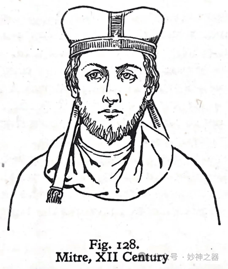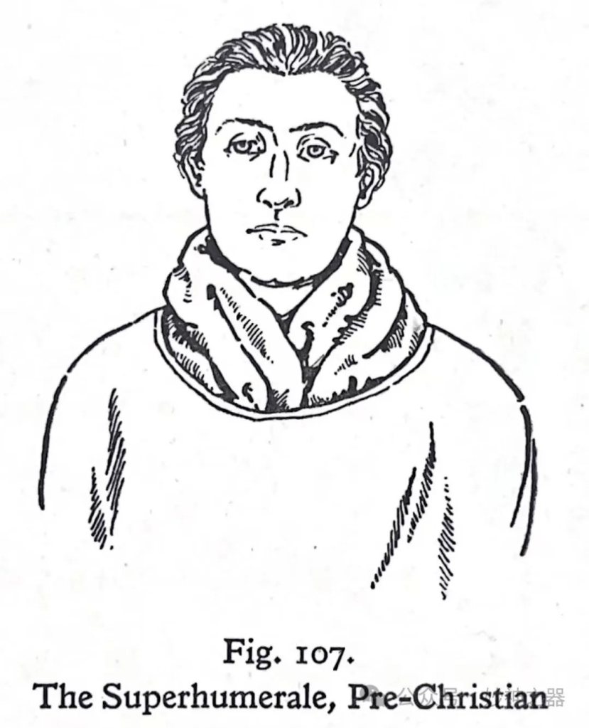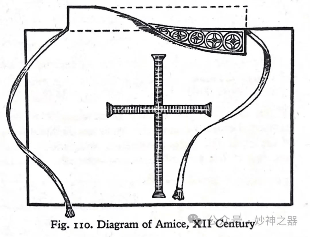 据《罗马礼书》(Ordo Romanus)记载,到755年,这种颈布已被天主教圣职人员采用,因此成为一种礼仪服饰,被称为AMICE。这个词来源于拉丁语amictus,古典作家用它来指代任何外衣。这里我们似乎又看到了一件服饰逐渐缩水的例子。(例如本书之前所提到的“白羊毛披肩”也是一例)