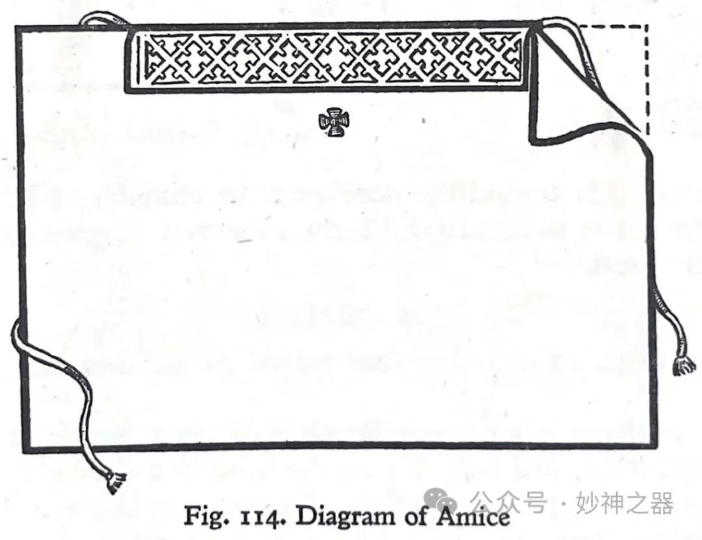 直到大约12世纪中叶,长方形的Amice才有了新的装饰。随后,方领巾加上一个大的金色十字架图案。图110显示了这一时期的一幅作品。它长30英寸,宽24英寸。方领巾上有一块称为“PARURA”的带子长26英寸,宽3.5英寸。方领巾(Amice)是司铎穿上所有礼仪服饰前的第一件服饰。当司祭蒙上这块布料前,他会亲吻其上的十字架。司祭用两根绳子将方领巾戴在头上,同时祈祷说:“主啊,求祢把救恩的盔戴在我头上,使我能抵挡魔鬼的侵袭”,然后把绳子套在他的下颌下面,又套在他的颈项上,图111显示了这样使用时的样子。