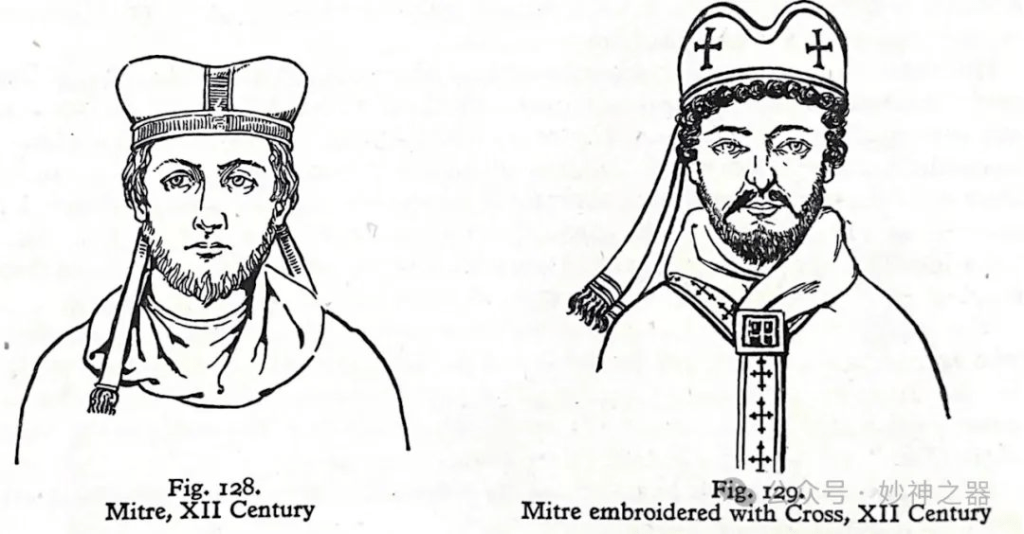 到12世纪初,圆形的牧冠开始从顶部向下塌陷,由一条从前面到后面的金带绑在一起,并连接到周围的金发带,并在后面结束。由于加了这一种装饰物,帽顶在带子的两边鼓了起来。虽然凸起部分有点僵硬,可能是填充以保持其形状,如图128。
