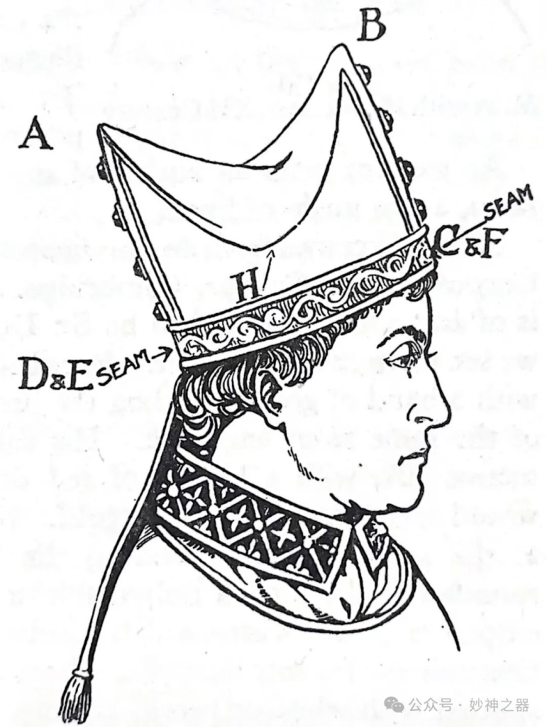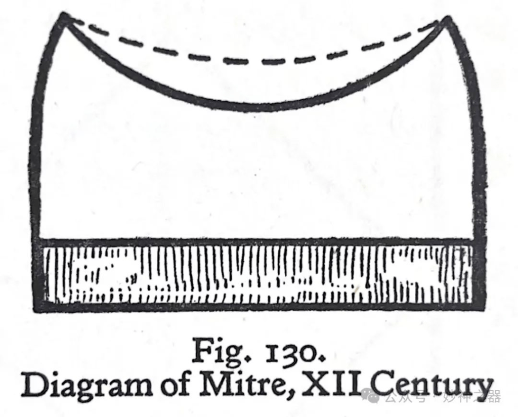 图130给出了一幅十二世纪早期的牧冠图,顶部明显的倾斜在两边产生了两个“角”。帽子是由两块白色亚麻布做成的,形状如图所示,并两边缝起来,可能用羊皮纸加固。冠上的缝隙一定是用一团材料填满的,如折线所示部分。根据教会文献记载,这种形状的圆顶牧冠——一种额头上有新月形凹陷的低帽——大约在1093年至1190年期间被坎特伯雷的某些总主教佩戴着。