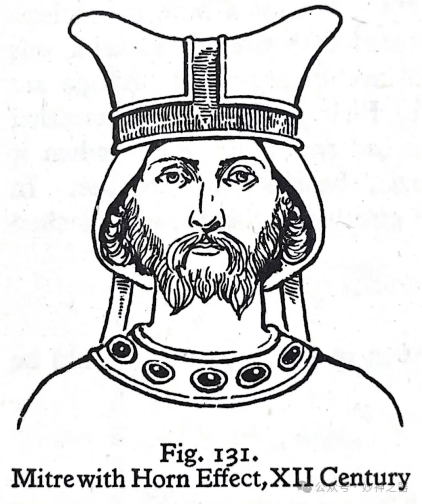 昂热圣莫里斯教堂(the Church of St. Maurice, Angers)的乌尔杰主教(Bishop Ulger)墓上的珐琅人物造型,呈现出更明显的角状效果,它是图128和130两种类型的集合。效果如图131所示,这种牧冠被戴在一条亚麻头巾上。