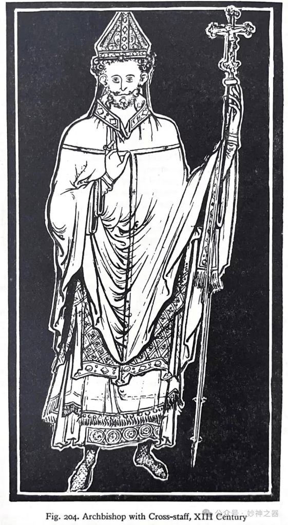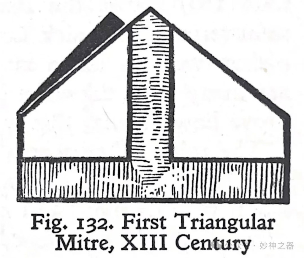 到了14世纪,牧冠尖顶的高度增加了,就像圣奥尔班修道院(St. Alban’s Abbey)为纪念修道院院牧多默.德拉米尔(Abbot Thomas Delamere)而制作的黄铜雕刻画一样。在性质、设计和形式上,它与图136所示的牧冠非常相似,但它显然要高得多,因此两边更陡峭。