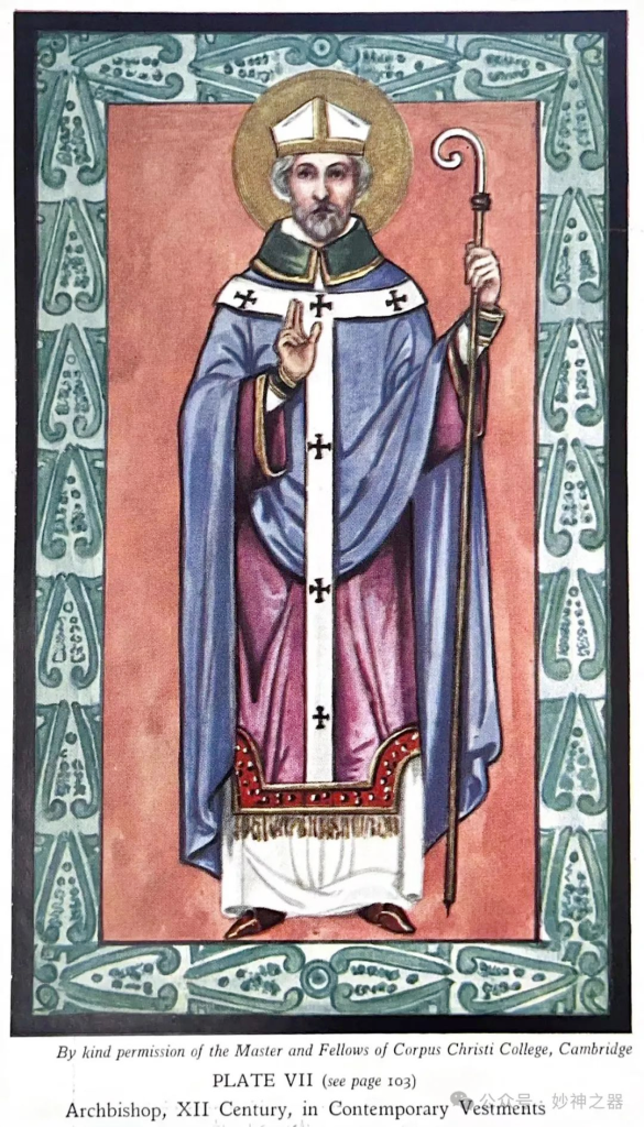 图例七出自剑桥大学圣埃德蒙兹伯里的“Magister Hugo”所著的《圣经》插图,绘制日期为1121-48年。它描绘了一位总主教,据说是圣邓斯坦(925-88)。这里我们看到这位主教佩戴着刚刚描述的牧冠。它是白亚麻布做的,额上有一条金带,前面和后面都有一条垂直的带子。