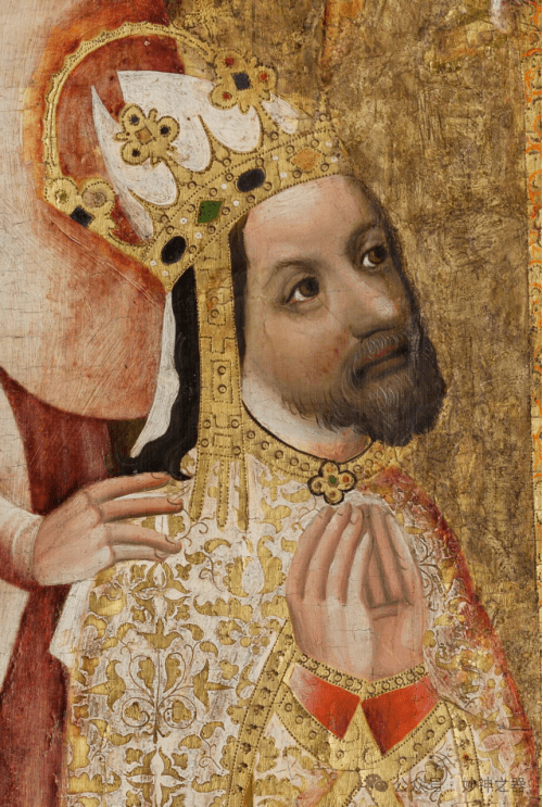 这些饰带由黄金制成,上面镶嵌着珠宝和珍珠,外围是用黄金和彩色丝绸绣有哥特式叶子图案的三角形。