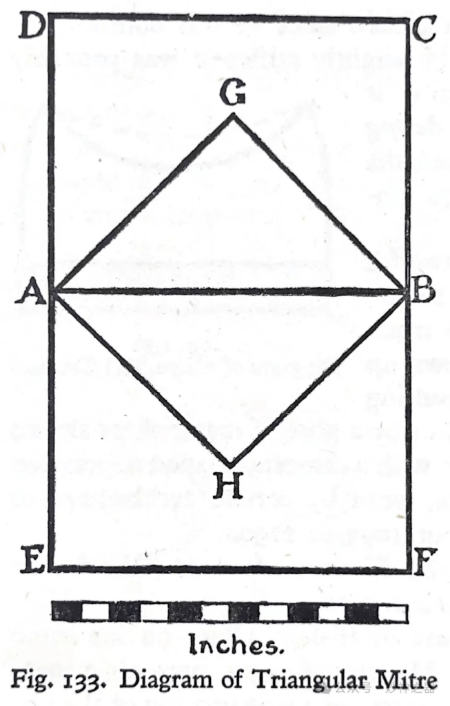 13世纪初不久,牧冠演变成如图134所示的我们熟悉的形状。它是由一块形状为矩形的材料形成的,大约12×18.5英寸(不允许接缝),图133,在AB处对折。两个接缝在EAD和FBC缝在一起。它再次被折叠成一个菱形,由AGBH四点组成。完整的牧冠戴在头上,前后都有缝线。在这些缝线上,用一圈金刺绣带(通常镶有珠宝)遮住缝线。另一根同样材料的装饰带环绕着头部,两端垂在后面大约18英寸,这条横条饰带(fillet)通常没有明显珠宝装饰,只是在末端有一个饰边。尾端有一对垂带,这就是INFULAE,有时被称为FANONS。