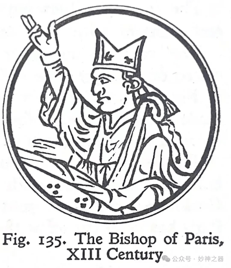 玛窦.帕里斯(Matthew Paris)的一幅画(《主要历史》,182页)描绘了巴黎总主教认真地照顾生病的圣路易九世(Louis IX),如图135。如上所述,主教戴着一顶牧冠;在同一幅作品中还有更多的绘画,证明了这种类型是多么受欢迎。