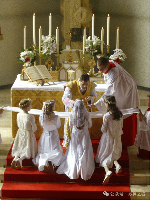 在图例第九版(彩色照片替代)中,身着白衣的司祭站在同一侧,右手奉上圣体,左手拿着圣体盘。
