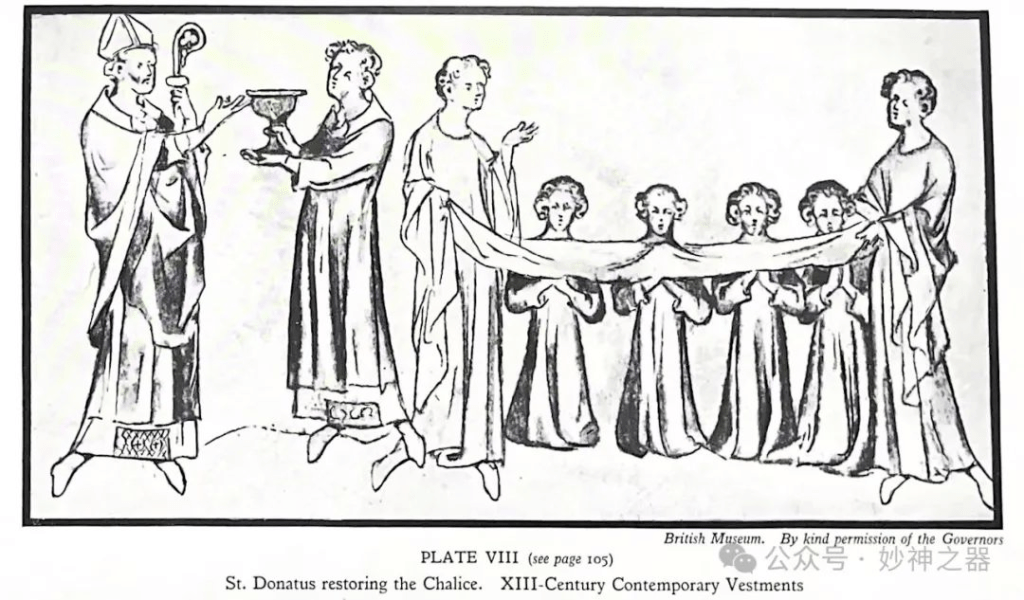 托斯卡纳的阿雷佐主教圣多纳图斯(公元前361年,St. Donatus)以他的奇迹而闻名,在14世纪早期的一本手抄本《圣咏集》中有所体现,这部作品曾属于玛丽一世女王(Queen Mary I),现藏于大英博物馆。 Royal 2, B.W. I. The illumination, folio 2596,再现于扉页第八版,其中主教站在左边。他穿着这一时期的礼仪服饰,其中包括一顶比图132中所见的稍高的白色亚麻布牧冠,并在冠底和前面用黄金镶边。他的其他衣服包括一件刺绣的长白衣、祭披、方领巾、五六品褂。他左手拿着一根权杖。