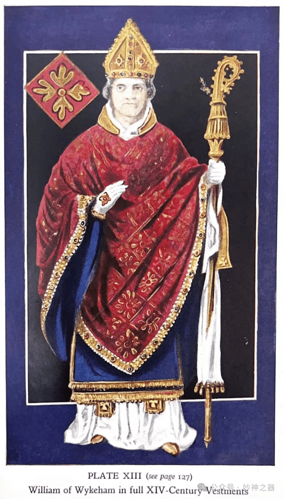 威克汉姆的威廉(William of Wykeham)在他的雕像上戴的是一顶“珍贵牧冠”(mitra pretiosa),镶嵌着红宝石和祖母绿。卷叶形花饰(Crockets)是由金色球体(spheres)造型形成的,见图例十三。