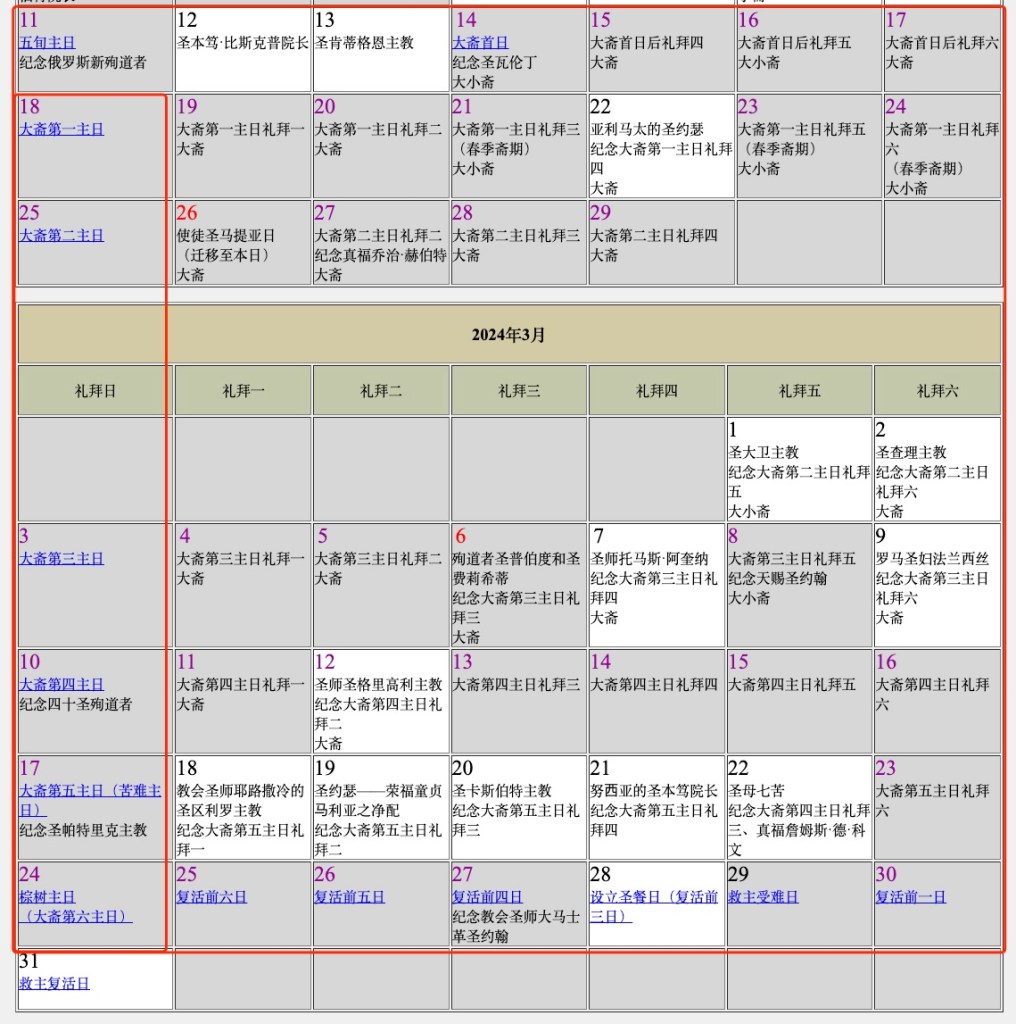 目前大斋期的计算方式是从大斋首日(圣灰礼拜三)开始,一直持续到复活主日,不含其中六个主日,一共40天,这种方式开始于7世纪的罗马。