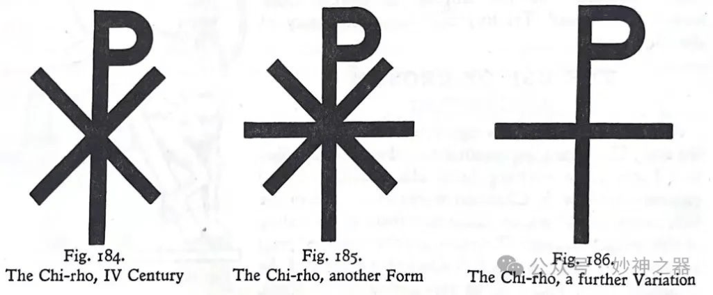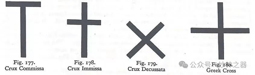 图184、185和186显示了三种十字架的外形变化,其中图184是最早的使用且最常用的。此后,这种类型成为罗马帝国官方的十字架范本。