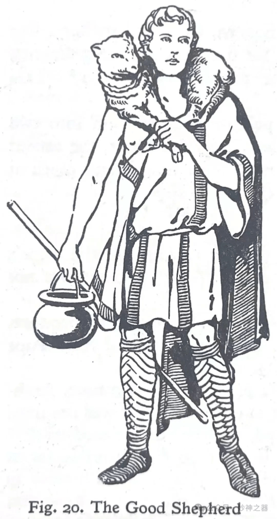 地下墓穴的壁画也把吾主基督描绘成一位牧羊人,祂把迷失的羊驮在肩膀上,见图20。