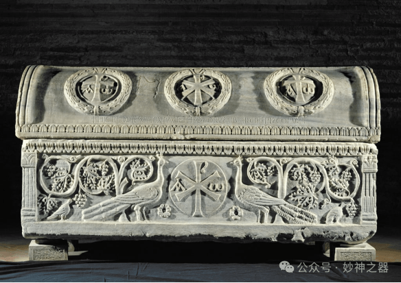 石棺上精心装饰着与君士坦丁十字架(chi-rho)略有不同的符号,它被圆圈包围,可能是用一种特殊的石头雕刻而成的,希腊人认为这种石头具有吞噬尸体的特性。这件十字架浮雕是最主要的主题。值得注意的是,十字架上X的角度小于90度,其两端向外张开;P也以主教权杖上的卷涡形式出现。在十字架的两臂之间插入了希腊字母alpha和omega,它们是希腊字母的第一个和最后一个字母,象征着永恒。
