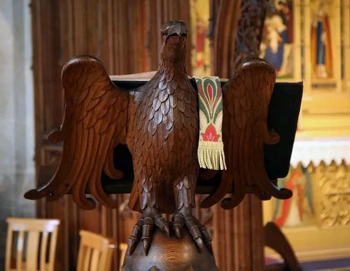 在圣道礼仪之中,宣读圣经的读经台,或者讲道员的证道台是人们眼睛关注的焦点之一。因此,讲台设计上,从简易到奢华,各有不同的形象,有的是华丽的老鹰,或者是展翅的鹈鹕。鹰形读经台就是一个老鹰形状的讲台,圣经放在老鹰展开的翅膀之上。这种读经台在圣公会的教堂、主教座堂,或者天主教堂都是非常常见的。