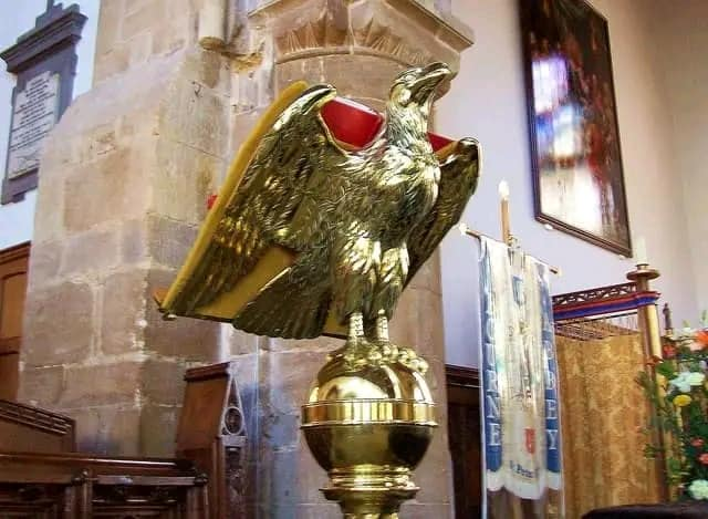 鹰象征意义就是,它是一种能直接凝视太阳的鸟,而基督徒也同样坚定不移的凝视上帝的启示。鹰能展翅翱翔,它强壮有力,威风凛凛,鼓舞人心,并它被认为是飞的最高,最接近天堂的鸟。因此,用它来做读经台,象征着上帝的话语传遍了世界的每一个角落。
