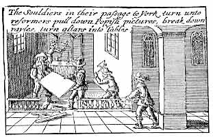 1640年,宗教會議頒布了一套新的教規,其中一條要求向祭壇鞠躬;但同年“長期議會”召開,譴責了這些教規——以及其他事項。1645年,勞德被處以斬首,四年後他的國王主子也步其後塵。在勞德被捕的那天,即1641年3月1日,一個委員會成立,要求廢除祭壇、燭台、圖畫和聖像、祭衣,以及現在“命令使用”這些物品的《裝飾規則》,還有許多教會儀式;但破壞行為更進一步,一個世紀前我們教堂的破敗狀況,相比起愛德華時期的掠奪者,現在更多是由清教徒的偶像破壞者造成的——管風琴被焚燒,彩色玻璃被砸碎,教堂被用來安置馬匹。我們可以從臭名昭著的威爾·道辛的記錄中了解到當時的情況,他是克倫威爾政府的代理人,負責破壞教堂,每間收費6先令8便士。他留下了他在一個又一個教區所作所為的驕傲記錄,甚至厭惡地記下在某個地方他只得到3先令4便士,因為那裡只有“十幅迷圖畫和一個苦像”需要摧毀。這是在1643年,位於劍橋附近的哈德威克。在鄰近的托夫特村,他期望為比平常更徹底的教堂“淨化”收取更多的慣例費用,但卻失望地只得到“6先令8便士”,用於摧毀“窗戶上二十七幅迷信畫,另外十幅石雕[美麗的雪花石膏祭壇屏,其碎片至今仍保存在教堂中],三幅其他石雕,三個銘文,為亡者祈禱,窗戶上各種為亡者祈禱[原文如此],以及一個鐘為聖凱瑟琳的靈魂祈禱。”在劍橋的皇后學院,他告訴我們,“我們打倒了110幅迷信圖畫,還有基路伯”;在彼得學院,“我們拆下了兩個巨大的有翅膀的天使,和其他各種天使,四傳福音者,以及彼得和他在禮拜堂門上的鑰匙,還有約100個基路伯”;而不幸的學院當局不得不自掏腰包支付他破壞他們禮拜堂的費用。只有通過某種未知的私人干預(是彌爾頓本人向克倫威爾求情嗎?),國王學院禮拜堂那“富麗堂皇的彩繪窗戶”才得以倖免於難,成為後世驚嘆的奇蹟——因為有記錄顯示國王學院的財務主管支付了額外的高額費用用於摧毀它們。這些事情需要強調;因為直到最近,我們教堂的荒涼狀況通常被認為是英國教會造成的。事實上,這是由她的敵人造成的;不是由《公禱書》制度造成的,而是由於該制度被破壞造成的。