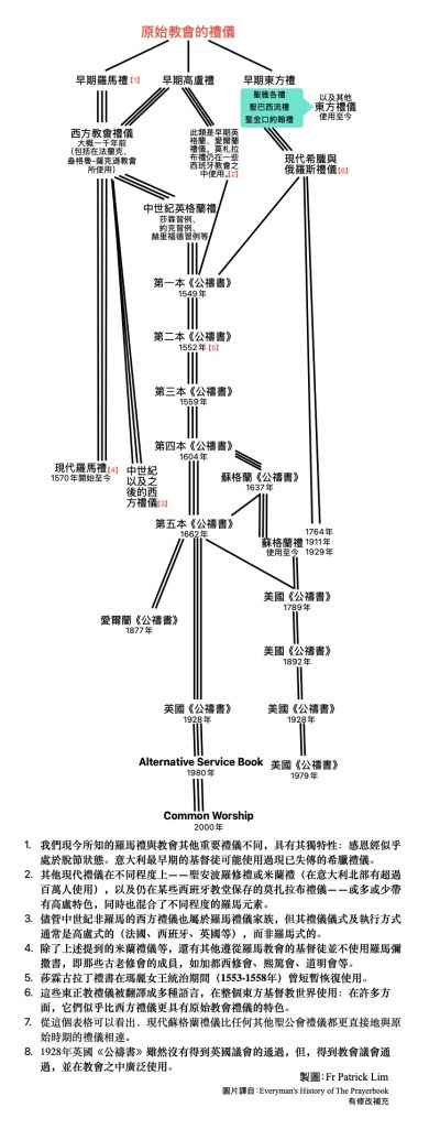 - 從這個表格可以看出,現代蘇格蘭禮儀比任何其他聖公會禮儀都更直接地與原始時期的禮儀相連。