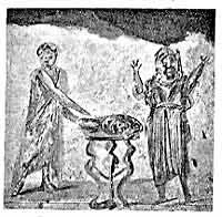 在本頁中,我們展示了一幅來自地下墓穴的二世紀聖餐象徵圖:主祭者身穿特殊的羅馬長袍,站在三腳架前伸出雙手,另一側站著一個祈禱者,以原始祈禱姿態(提摩太前書2:8)站立,在早期世紀中這種姿態始終代表著亡者的靈魂。愛宴也是這些儀式的一部分,在《希坡律陀法規》(Canons of Hippolytus,約公元250年)中提到了愛宴和聖餐。在地下墓穴中還保存著一幅三世紀的圖畫,一部分描繪了一位貴婦和她的女僕在蔬果店購買愛宴用品(可能還有鮮花),另一部分則展示了眾人圍坐在餐桌旁參加宴會。愛宴的一個獨特遺跡仍然存在,那是一世紀專門為愛宴建造的大廳。它包括一個帶有大型三榻廳的房間,石質長椅仍留有痕跡,還有一個小房間、廚房(出土了酒罐和器具)、一口井和蓄水池:這個房間是聖多米蒂拉地下墓穴的前廳,只有部分在地下,原本在大路上有裝飾性的正面。地下墓穴內的禮拜堂數量眾多:在第四章就展示了一個較晚期(四世紀)的卡利斯托地下墓穴禮拜堂的復原圖。