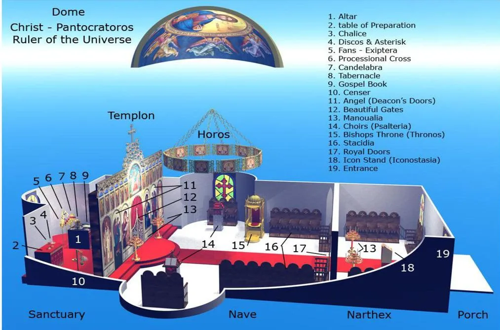 东正教教堂通常有三个主要区域:外厅(入口厅)、中殿(圣殿主体)和祭坛区。这些区域分别对应外院、圣所和至圣所(出埃及记 26:30-37,27:9-19;列王纪上 6:14-36;历代志下 3-4 )。